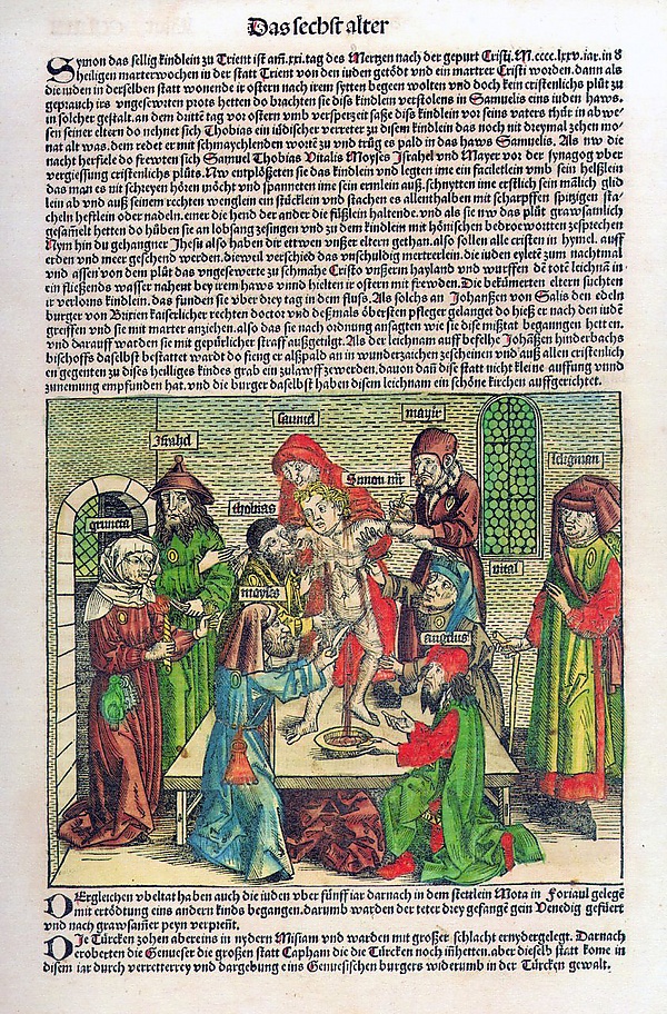 | 1494 | Тирнау, Венгрия (венг: Nagyszombat, сегодняшнее название — Трнава, Словакия) | Под пытками были получены абсолютно нелепые, даже невозможные показания от женщин и детей, которые, будучи обвинёнными, предпочли смерть как путь избавления от пыток и согласились подтвердить всё, что от них требовали. Они даже сказали, что у евреев-мужчин бывают менструации и что в качестве средства облегчения им приходится пить христианскую кровь. | |||