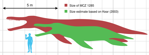 Однако, в 2003 году для образца MCZ 1285 было предложено заметно меньшее значение длины в 9—10 метров[10]. Основываясь на размерах шейных позвонков, в 2012 году учёные оценили длину черепа MCZ 1285 в приблизительно 2190 мм. Однако, этот подход использовал «среднюю» ширину шейных позвонков из тех, что сохранились, и может быть неточным в зависимости от пропорционального изменения размера позвонков в шейном отделе позвоночника. Используя регрессионную линию (Knutsen et al. 2012 год), эта реконструкция предполагала длину черепа в 2850 мм[8][2].