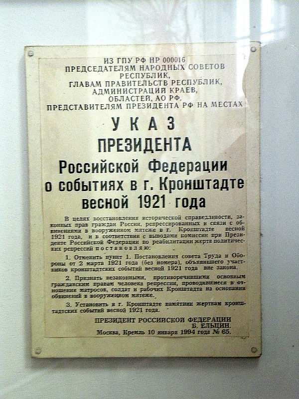 - Ельцин Б. Н. Указ Президента РФ от 10.01.1994 № 65 «О событиях в г. Кронштадте весной 1921 года» // Garant.ru. — 1994.