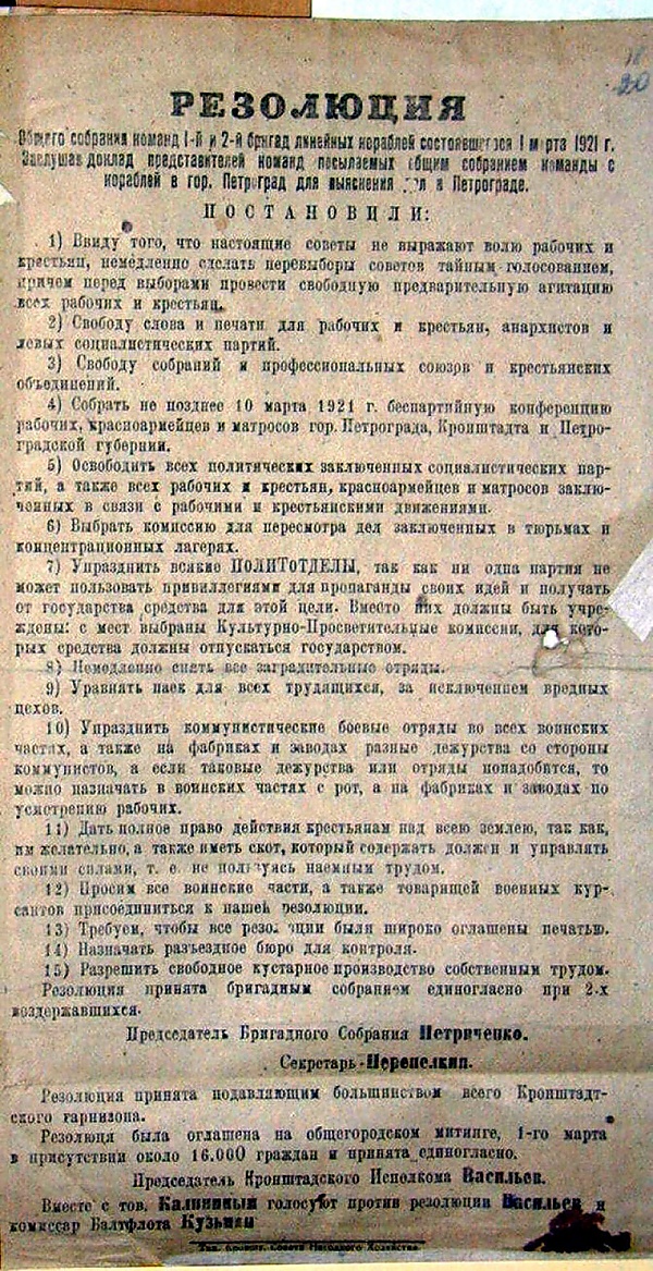 - Ввиду того, что настоящие Советы не выражают волю рабочих и крестьян, немедленно сделать перевыборы Советов тайным голосованием, причем перед выборами провести свободную предварительную агитацию всех рабочих и крестьян.