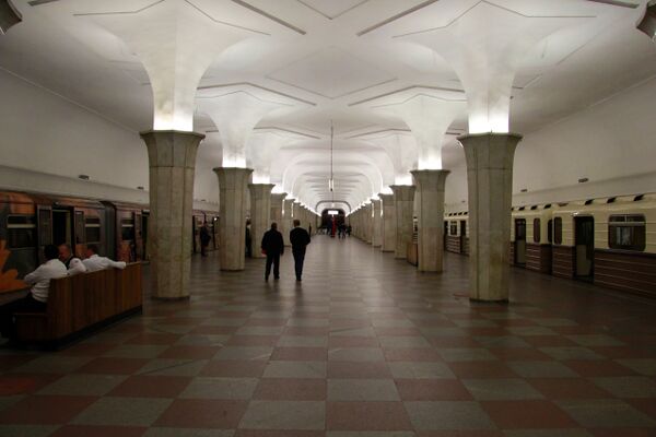 Десятигранные колонны станции и путевые стены отделаны серовато-белым уральским мрамором «коелга» (до конца 1950-х годов путевые стены были покрыты фаянсовой плиткой). Пол выложен розовым и серым гранитом в шахматном порядке (первоначально покрытие было асфальтовым). Светильники вмонтированы в капители в верхних частях колонн. Стены кассового зала облицованы марблитом[1][7].