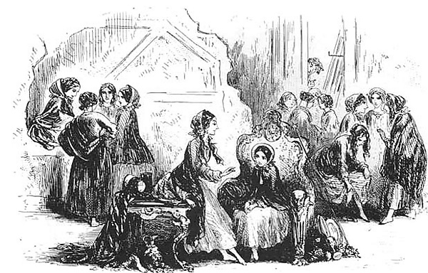 Фронтиспис Хеболта Брауна к первому выпуску «Крошки Доррит» в журнале «Домашнее чтение» красноречиво представляет Британию. Она изображена здесь в окружение свиты, которой руководят два слепых старика. Толпа добирается до указательного столба, который направляет их в противоположном нужному им направлении. Позади виднеется колонна мужчин. Далее выступает Британия, которую сопровождает группа хорошо одетых господ с самодовольными улыбками. За фалды одного из них цепляется маленький человечек, на фалдах которого висят двое других, скорчившихся так, что напоминают животных. В конце процессии находятся группа нянек и детей — они символизируют новое поколение. Посреди этих людей на повозке восседает печальная фигура Британии с головой, опущенной на руку, которая в свою очередь опирается на щит, лежащий на её коленях вместе со слегка приподнятым трезубцем[132]. Так показана Британия в романе Диккенса, не как высокая женщина в шлеме с гордо поднятым трезубцем и щитом, правительница морей, а как несчастная сникшая особа, окруженная множеством бездарных и глупых людей.