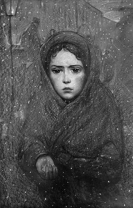 …у почтовых станций и в других местах остановок эти жалкие создания казались ей единственными реальными явлениями из всего, что она видела; и нередко, раздав все свои деньги, она в своей праздности задумчиво смотрела на крошечную девочку, которая вела за руку седого отца, как будто это зрелище напоминало ей что-то знакомое из прошлых дней.