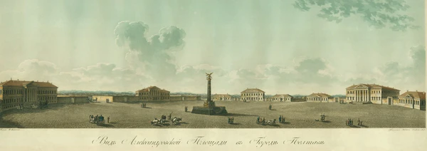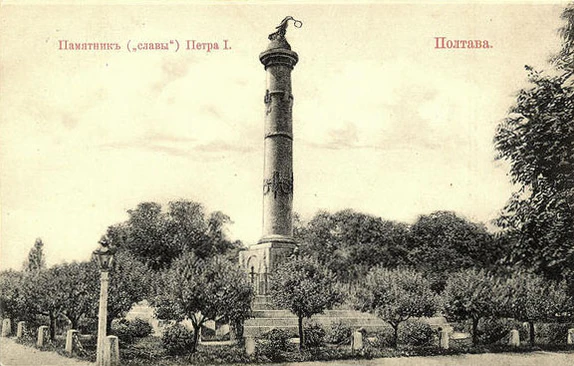 В 1805 году, по предложению генерал-губернатора князя Алексея Куракина, было решено строить памятник и главные губернские сооружения именно на Круглой площади. Площадь была названа Александровской, а архитектором, которому было поручено строительство ансамбля, стал Михаил Амвросимов. Были спроектированы: дом Полтавских губернских присутственных мест, дом Полтавского гражданского губернатора, дом Полтавского вице-губернатора, дом Малороссийского почтамта, дом Полтавского дворянского собрания, уездные присутственные места, губернская гимназия. Большая часть сооружений была построена в 1806—1811 годах по проектам петербургского архитектора Андреяна Захарова. Чуть позже были построены почтамт и Дворянское собрание, правда, проект гимназии остался не реализованным, впрочем, с северной стороны площади в 1835—1840 годах был построен Полтавский кадетский корпус. В самом же центре площади был возведен Монумент Славы, установленный на пересечении осей восьми улиц. Монумент представлял собой колонну высотой в 16 метров, с позолоченным орлом на вершине.