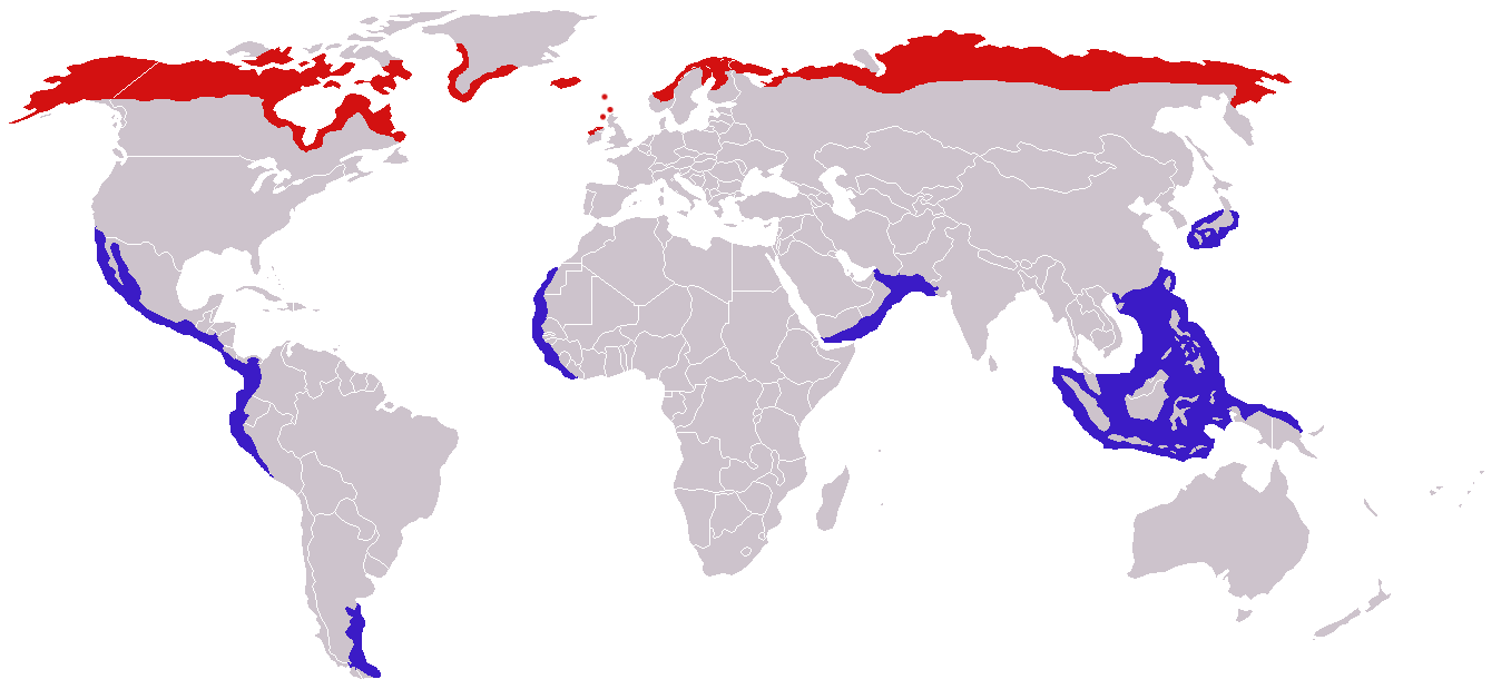 Зимуют в открытом море вдоль межтропической полосы, хотя в этот период отдельные особи могут встречаться в любом океане южнее тропика Рака, вплоть до побережья Патагонии в Южной Америке.
