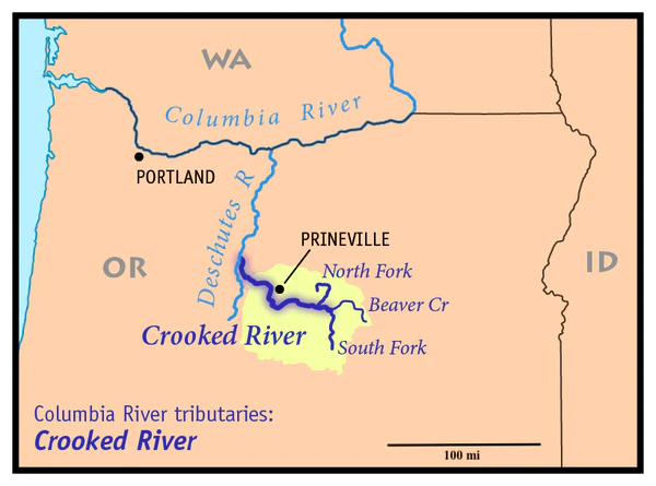 Река Крукед-Ривер начинается в округе Крук (Орегон)[2], на высоте 1104 м, при слиянии водотоков Бивер-Крик и Саут-Форк-Крукед-Ривер[5][6]. После этого река течёт сначала в западном, а затем в северо-западном направлении, протекая по округам Крук, Дешут и Джефферсон[2]. На реке находится город Прайнвилл — административный центр округа Крук[3].
