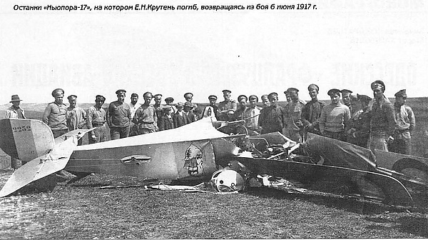 19 июня 1917 года, возвращаясь с очередного боевого задания, при заходе на посадку на малой высоте самолёт «Ньюпор-17» (с изображением Ильи Муромца), который пилотировал капитан Евграф Крутень, врезался в землю. Пилот погиб. В телеграмме в Авиационную канцелярию об обстоятельствах гибели капитана Евграфа Николаевича Крутеня сообщалось: «…Разбился насмерть вследствие перехода самолёта в штопор на высоте 20 — 30 метров после крутого поворота»[7].