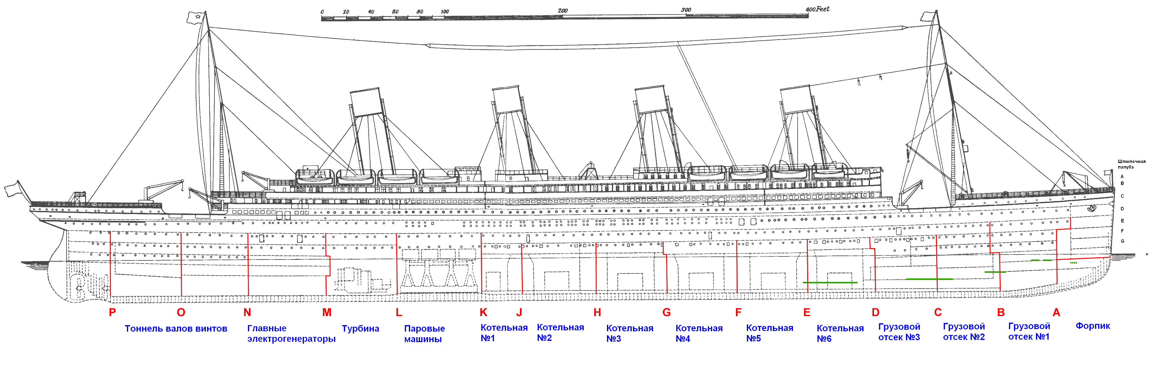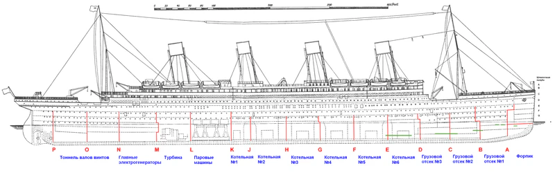 Первые пострадавшие появились в котельной № 6. В момент столкновения там раздался оглушительный грохот и скрежет рвущихся стальных листов. Казалось, что взорвался весь правый борт, в котельную хлынула бурлящая океанская вода. В ту же секунду прозвучал сигнал тревоги, над герметичной дверью в переборке, отделявшей шестую котельную от пятой, зажёгся красный свет, и герметичные двери стали медленно опускаться. Несколько кочегаров из тех, кто не успел выскочить, выбрались на палубу F по аварийному трапу, но им было приказано вернуться, закрыть заслонки и погасить топки. Кочегары принялись за работу, но через пять минут оказались уже по пояс в воде, разбавленной машинным маслом, и покинули котельную. В котельной № 5 пробоина протянулась примерно на 60 сантиметров от переборки, отделявшей этот отсек от быстро затапливавшейся котельной № 6. Уровень воды здесь удавалось контролировать с помощью оперативно установленных механиками и кочегарами насосов[87]. Через 10 минут после столкновения к люку, ведущему в котельную № 6, вернулся кочегар Фредерик Барретт. По его словам, ледяная вода заливала раскалённые угли в топках, вся котельная была окутана паром, из-за которого ничего не было видно[88].