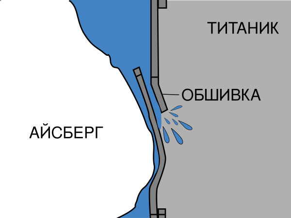 Правый борт лайнера задел подводную часть айсберга. В момент столкновения на корпус лайнера пришлось давление 2,5 тонны на см². Стальные листы обшивки толщиной 2,5 см выдержали, а железные заклёпки с микротрещинами, которые их скрепляли — нет. В момент удара они лопнули, швы разошлись, образовав щели, через которые в первые пять отсеков хлынула забортная вода. Контакт длился около 9 секунд. В результате «Титаник» получил несколько крупных пробоин ниже ватерлинии. От удара от надводной части айсберга откололись крупные куски, которые упали на носовую межнадстроечную палубу судна[77].