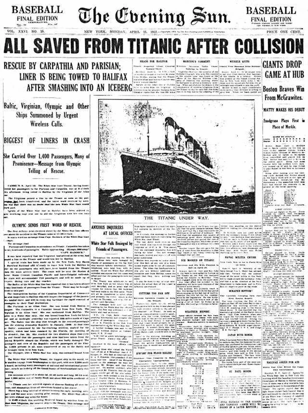 12 апреля на «Титаник» по радиотелеграфной связи (при помощи азбуки Морзе) начали поступать сообщения от судов, проходивших вблизи Большой Ньюфаундлендской банки. Их экипажи обращали внимание на необычайно большое скопление айсбергов, оказавшихся значительно южнее, чем бывало в это время года. Каждое такое сообщение после приёма передавалось вахтенному помощнику, а затем в штурманскую рубку, где указанные координаты ледяных полей наносились на карту[50]. Речь шла о районе, расположенном севернее запланированного маршрута «Титаника», поэтому оснований для беспокойства не было[51].