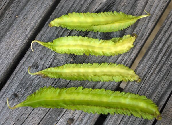 Плоды — четырёхгранные бобы длиной 10—25 (иногда до 40) сантиметров с четырьмя волнистыми и зубчатыми тонкими крылышками шириной 0,5—1,5 см. Цвет их обычно светло-зелёный, иногда с красными или фиолетовыми пятнышками. Содержит 5—20 округлых семян диаметром 6-10 мм. Цвет семян может быть различным: белые, жёлтые, коричневые, чёрные.