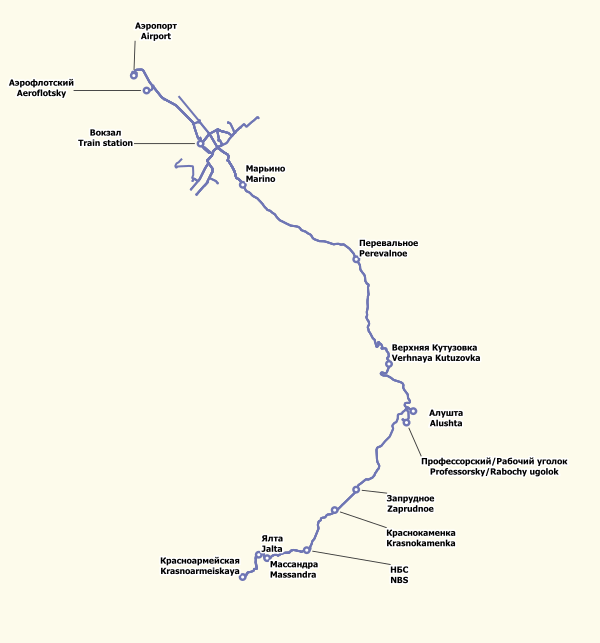 | 55 | Аэрофлотский | ж/д Вокзал — Алушта — Партенит — Артек — Гурзуф | Ялта | Закрыт в 2018 году. | |||