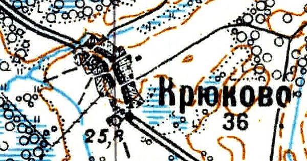 КРЮКОВО — деревня владельческая при колодцах, число дворов — 14, число жителей: 47 м. п., 38 ж. п.; Часовня православная[9]. (1862 год)