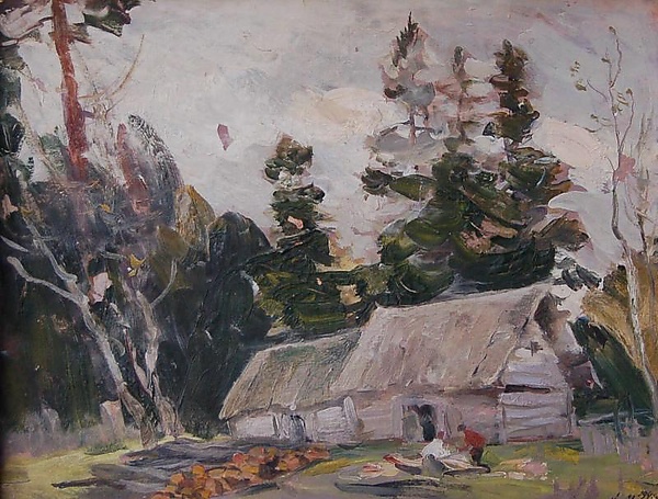 Картина выполнена в традициях бытового жанра и пейзажа. На первом плане справа изображена изгородь, за которой виден двор. Слева расположены сложенные бревна, а справа две фигуры заняты работой с пилой, что подчёркивает сцену повседневного труда. На втором плане слева находится дерево и бревенчатый дом с пристройкой, что дополняет изображение сельского быта.