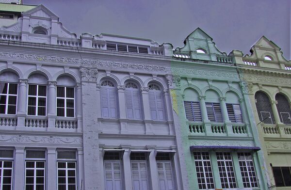 - Рядовая застройка старого города после пожара и наводнения в конце XIX века выполнена в стиле домов-магазинов, характерном для южного Китая.