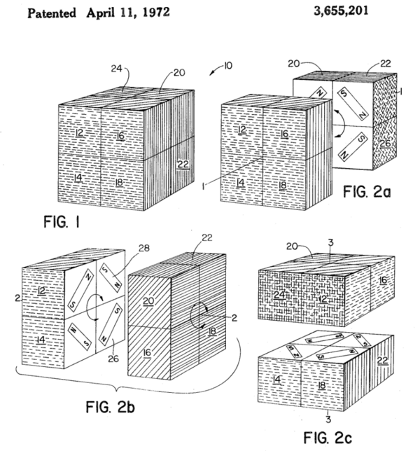 История кубика Рубика началась в марте 1970 года, когда Ларри Николс изобрел куб-головоломку 2×2×2 с вращающимися частями, собранными на магнитах. Изобретатель сразу подал заявку на оформление канадского патента и уже 11 апреля 1972 года Николс получил американский патент под номером 3655201 (позднее, в 1986 году апелляционный суд подтвердил, что карманный кубик Рубика 2×2×2, по причине сходства изобретений, нарушает авторские права Николса). 9 апреля 1970 года Франк Фокс подаёт заявку на сферическую головоломку 3×3×3, и 16 января 1974 года получает патент (1344259)[3].