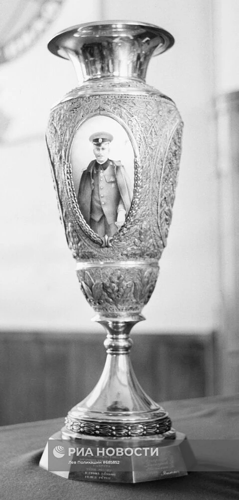 Кубок украшен узорами, а также чёрно-белым портретом Петра Нестерова.