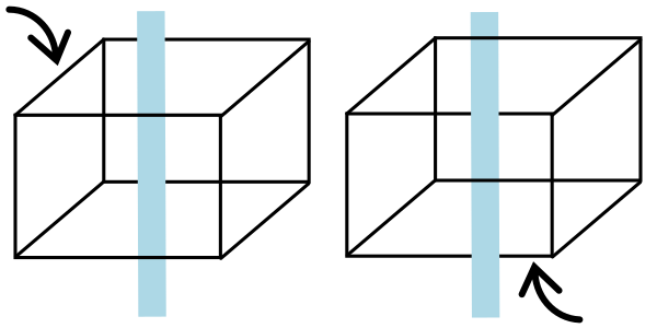 На левом кубе промежуточный объект (голубая полоска) кажется идущей «сверху» через верхнюю грань, в то время как на правом кубе объект кажется идущим «снизу» через нижнюю грань. Это показывает, как может измениться ракурс просто при изменении грани, которая оказывается сзади исследуемого предмета.
