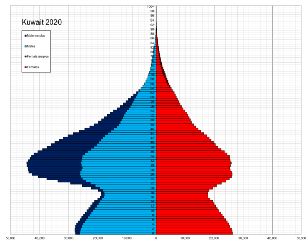 По данным всемирной книги фактов ЦРУ численность населения Кувейта в 2021 году составила 3 032 065 человек. По оценке на 2018 год этнический состав Кувейта: Кувейтцы — 30,4 %, арабы других национальностей — 27,4 %, азиаты — 40,3 %, африканцы — 1 %, другие — 0,9 % (включая европейцев, североамериканцев, южноамериканцев и австралийцев). Государственное управление гражданской информации Кувейта оценивает общую численность населения страны в 4 420 110 человек на 2019 год, причём иностранцы составляют почти 70 % населения страны. Городское население — 100 % (2021 год)[30]. Большая часть населения сосредоточена в столице Эль-Кувейте. Суммарный коэффициент рождаемости на 2021 год — 2,25 рождений на женщину[30]. Грамотность — 96,1 %; мужчин — 96,7 %, женщин — 94,9 % (2018 год)[30]. Около 24,29 % населения составляет возрастная группа до 15 лет, 72,79 % — от 15 до 65 лет, 2,92 % — старше 65 лет[30]. В 2021 году рождаемость оценивалась в 17,9 на 1000 населения, смертность — 2,23 на 1000, иммиграция — −3,65 на 1000, прирост населения составил 1,2 %. Младенческая смертность — 7,6 на 1000 новорождённых[30]. Ожидаемая продолжительность жизни населения по состоянию на 2021 год — 78,9 лет, у мужчин — 77,44 лет, а у женщин — 80,43 лет[30]. Средний возраст населения по состоянию на 2020 год — 29,7 лет (мужчины — 30,7 лет, женщины — 27,9 лет)[30].