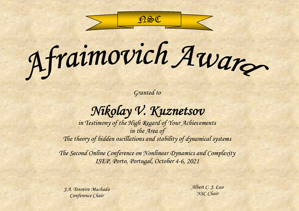 - Aframovich Award in the testimony of high regard of your achievements in the area The theory of hidden oscillations and dynamical systems, 2021