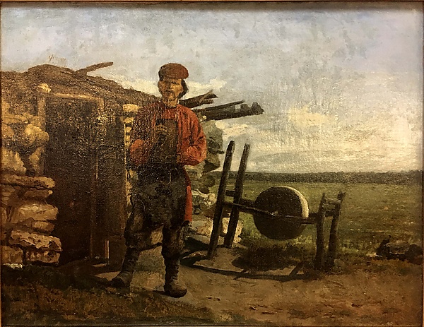 Левее фигуры расположено небольшое бревенчатое строение кузницы с плоской кровлей и открытой дверью. В правой части видны деревянные козлы с круглым точильным камнем. В глубине картины изображён зелёный луг, уходящий к горизонту, за которым тянется тёмная полоса леса. Небо светлое, голубое, с белыми облаками в нижней части.