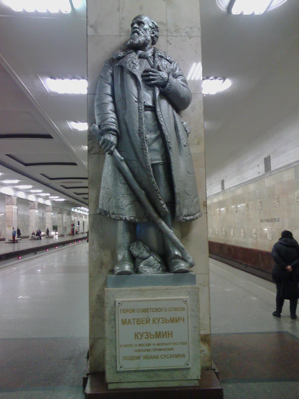 В 1944 году в Москве на одной из платформ станционного зала станции метро «Измайловский парк культуры и отдыха имени Сталина» (затем называлась «Измайловский парк», а ныне «Партизанская»)[14] и в Великих Луках на могиле героя были установлены его памятники[15], а на месте подвига у деревни Малкино, на «Малкинской высоте» — обелиск[2]. Под скульптурным изображением Кузьмина на станции метро «Партизанская» (работа М. Г. Манизера) указано, что он повторил подвиг Ивана Сусанина[3]. Деревня Малкино является памятным местом.