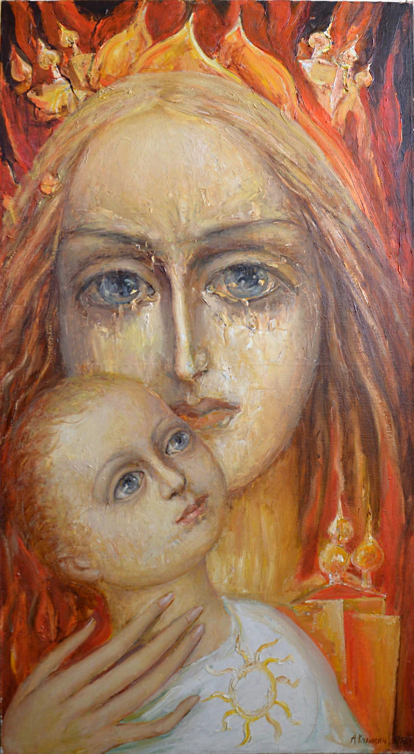 Главной героиней живописи Алексея Кузьмича всегда была Женщина, через образ который он изображал идеалы добра, чистоты и красоты. Сам художник характеризовал своё кредо следующим девизом: «Кто любит женщину, кто любит мир, кто пишет женщину, тому помогает Бог»[2]. В стилистике произведений на тему Мадонны стала проступать некоторая иконная образность, имеющая значительное художественное воздействие. Художником было создано всего более 700 «мадонн»[3]. Серии «В раю» (1983—84), «Мадонна с падшим ангелом» (1984—86), «Серебряные Мадонны» (1986—1996), «Сошедшая с небес» (1988—96), «Полесские Мадонны» (1995—96), «Государственные Мадонны», «Страдания Руси в XX веке» (обе 1997—98) и др[4][5].