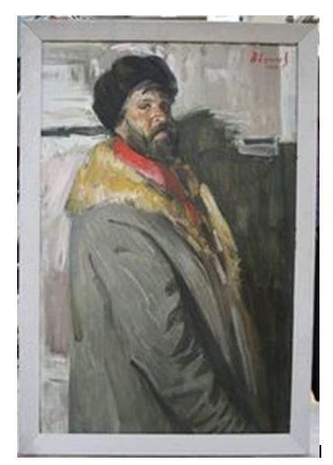 На картине представлен поколенный портрет мужчины с тёмными усами и бородой. Он изображён в чёрной шапке, тулупе с рыжим воротником и красном шарфе, стоящим с опущенной вниз рукой в трёхчетвертном повороте вправо. На заднем плане видна серая дощатая дверь.