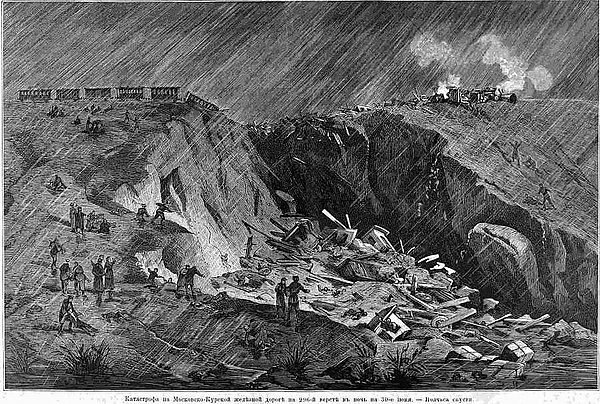 «Вспоминаю момент приезда: […] Огромный глубокий овраг пересекает узкая, сажень до двадцати вышины, насыпь полотна дороги, прорванная на большом пространстве, заваленная обломками вагонов. На том и другом краю образовавшейся пропасти полувисят готовые рухнуть разбитые вагоны. На дне насыпи была узкая, аршина в полтора диаметром, чугунная труба — причина катастрофы. […] Два колена трубы, пудов по двести каждая, виднелись на дне долины в полуверсте от насыпи, такова была сила потока…[3]».