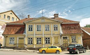 Здание рядом с мостиком Латвийской Венеции. Дом украшают входная дверь с окошком второго света, а также один из самых старинных флюгеров с изображение мифического животного — единорога.