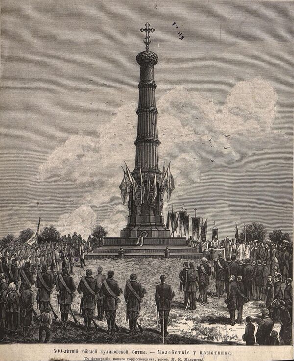 В 1852 году на том месте, которое считалось Куликовым полем, по инициативе первого исследователя великой битвы обер-прокурора Святейшего Синода С. Д. Нечаева, был поставлен и торжественно открыт памятник-колонна, изготовленный на заводе Ч. Берда по проекту А. П. Брюллова.