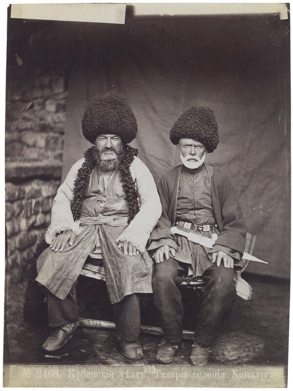 Сходен был с азербайджанским мужской и женский костюм живущих в Азербайджане талышей. Мужчины также носили архалыг, чарыхи, арахчын. У женщин существовал специальный костюм для работы на рисовых плантациях (из коротких, до колен, штанов и заправленной в них рубахи), вместо шёлкового платка зимой голову покрывали шерстяным платком, шалью, существовал обычай повязывать вокруг поясницы платок для тепла[39]. Сходна с азербайджанской была и национальная одежда удин, которые после носили одежду уже городского типа[40]. Мужская одежда будугцев, крызов и хиналугцев почти не отличалась от одежды соседнего населения Азербайджана, а женская была более своеобразной — в неё входили суконные штаны, бязевая рубаха и сверху короткий архалыг; спереди повязывали фартук (габагдык), на голову надевали чутку и шаль[41]. Костюм татов на протяжении веков не отличался от азербайджанского; пожилые женщины носили закрывающую волосы чутку (чехол из ситца), поверх которой покрывали большой платок (чершо), в торжественных случаях надевали тяжёлые серебряные пояса (кемер)[36].