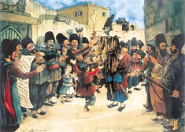 Истоки театрального искусства азербайджанского народа связаны с древнейшими народными празднествами и плясками[95][96]. Элементы театрального действия присутствуют во многих видах азербайджанского народного творчества — в играх («гизлянпач» — прятки, «кесалдыгач» — игра в поло), игровых песнях («кэпэнэк» — мотылёк, «бэновшэ» — фиалка), в свадебных обрядах («нишан» — обручение, «дуахгапма» — снятие вуали с лица невесты, «той» — свадьба), календарных празднествах («новруз» — наступление весны, «кэв-сэдж» — подготовка к зиме)[97]. К первичным формам театральных представлений относят коллективный мужской танец «яллы», выступления скоморохов, кяндирбазов (канатоходцев), мухрадуздов и мухребазов, представления дервишей, «заклинателей» змей. Важную роль в становлении народного театра Азербайджана сыграли такие известные в народе театрализованные сцены, как «Коса-коса», «Гаравелли», «Шах Селим», «Кечал пехлеван» («Лысый богатырь»), « Джейран-ханум» («Госпожа Джейран»), «Марал оюну» («Оленья игра»), «Кафтаркос» («Гиена»), «Хан-хан» («Повелитель — судья»), «Тапдыг чобан» («Пастух Тапдыг»), «Тенбель гардаш» («Брат лентяй»)[98].