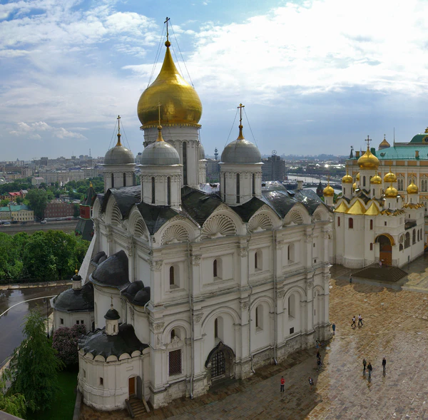 Первыми среди русских земель каменное строительство возобновили Новгород и Псков (церкви Спаса на Ильине улице, Федора Стратилата на Ручью, Василия на Горке). В Московском же княжестве первые каменные постройки относятся к началу XV века: Успенский собор в Звенигороде (1400), а также соборы Саввино-Сторожевского (1405), Троице-Сергиева (1422) и Андроникова (1427) монастырей. Позднее были сооружены соборы Московского Кремля — Успенский (1475—1479), Благовещенский (1481—1489), Архангельский (1505—1509), а также Грановитая палата (1487—1491)[1][2].
