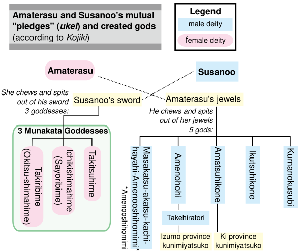 В «Кодзики» («Записки о древних делах») и «Нихон сёки» («Хроники Японии») он является одним из пяти (или шести в третьей книге «Нихон сёки») божеств, которых воплотил Сусаноо-но-Микото после того, как Аматэрасу дала ему подарки.