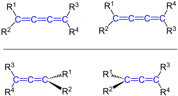 Результатом этого является цис-транс-изомерия кумуленов с нечётным числом кумулированных связей и аксиальная хиральность (точечная группа D2d) асимметрично замещённых алленов и кумуленов с чётным числом, образующих энантиомеры.