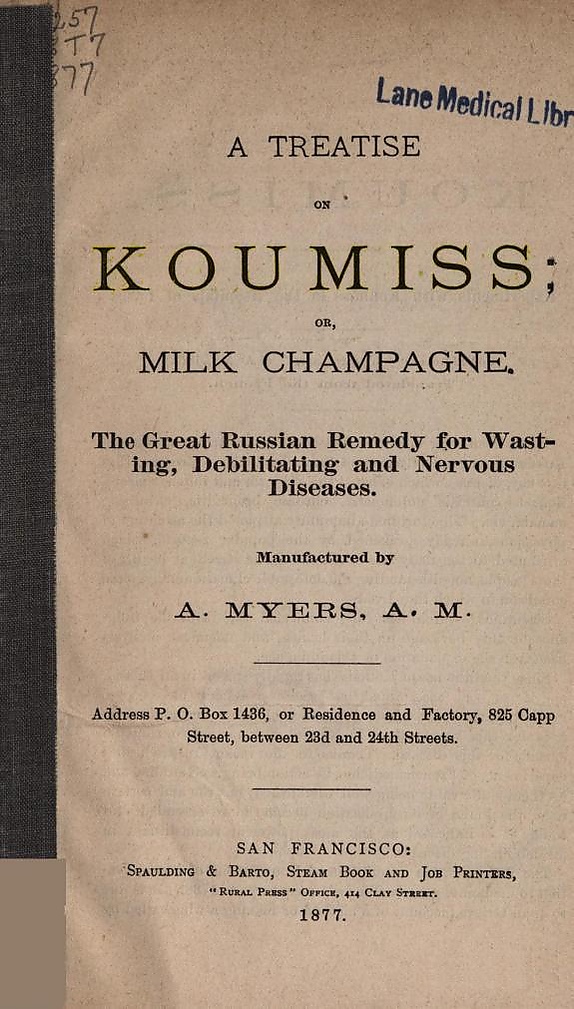 Мода на кумыс распространилась из Европы в США, и вскоре заговорили о «молочном шампанском» как о великом русском средстве от изнуряющих болезней и нервных расстройств, несомненно, благодаря его питательности и опьяняющему эффекту. В начале XX века санатории, предлагающие лечение кумысом, существовали в Париже, Нью-Йорке, Вашингтоне, Чикаго, Филадельфии и Сан-Франциско[11].