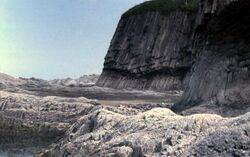 В строении острова принимали участие вулканические породы (андезиты, базальты), вулканические пеплы, а также осадочные отложения (сланцы, пески, галечники, ракушечники и т. п.). Большое распространение имеют вулканические туфы, которые состоят из скопления округлых вулканических бомб или угловатых обломков горных пород, сцементированных пеплом[30]. При выветривании бомбовых туфов они распадаются на округлые валуны различного диаметра. Следы выветривания можно наблюдать на побережье острова. Особенно интересные выветривания столбчатой отдельности излившихся пород имеются в памятнике природы на юге острова близ пос. Третьяково (мыс Столбчатый).