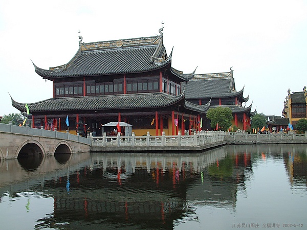 - Старинный городок Чжоучжуан, известный как «Венеция Востока», славится своими живописными каналами и мостами, историческими особняками и храмами. Среди главных достопримечательностей — «Двойные мосты» (Шуан цяо), мост Фуань, башня Милоу, даосский храм Чэнсюй (Цюаньфу) XI века. Кроме того, в Чжоучжуане регулярно проводятся различные фестивали, в том числе Куньшаньский фестиваль фонарей[21][22][23][24].