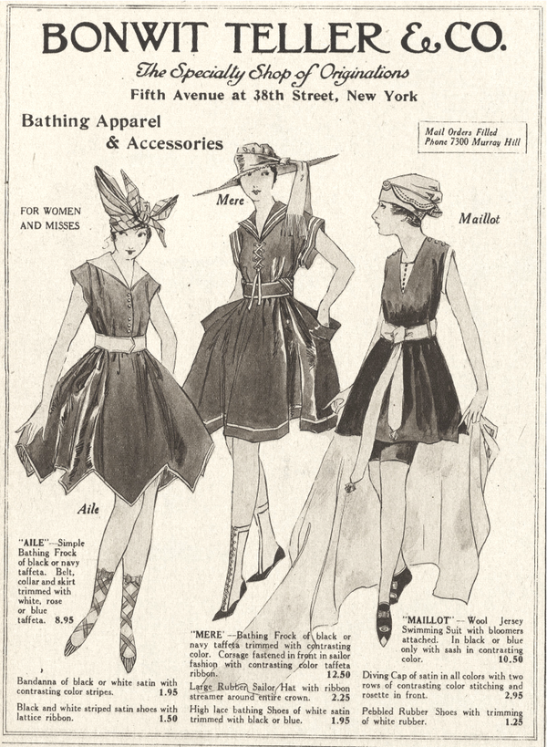 К началу XX века купальный костюм становится проще и демократичнее, а главное — короче. Исчезают оборки, окончательно уходят в прошлое «купальные чулки» и прочие приспособления для «сохранения благонравия».