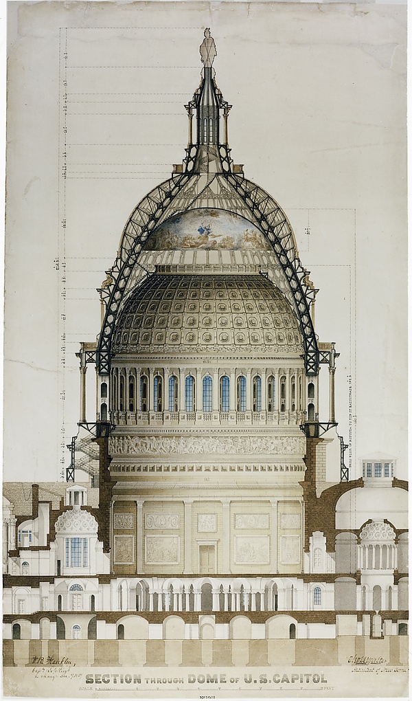 Нынешний чугунный купол Капитолия Соединённых Штатов — это уже второй купол, находящийся над зданием. В мае 1854 года появились планы построить новый, чугунный купол Капитолия Соединённых Штатов, подкреплённые соображениями эстетики и пожарной безопасности[9]. Находившийся под влиянием больших куполов Европы Уолтер обратил особое внимание на Пантеон в Париже, собор Святого Павла в Лондоне и Святого Петра в Риме. Кроме того, в 2003 году американские эксперты обнаружили в библиотеке Конгресса документы, которые свидетельствуют о том, что при проектировании купола архитектор Томас Уолтер пользовался чертежами Огюста Монферрана — архитектора Исаакиевского собора, отсюда и поразительное сходство куполов американского здания и бывшего главного кафедрального собора Российской империи[10]. Уильям Аллен, историк Капитолия, охарактеризовал первую конструкцию Уолтера как