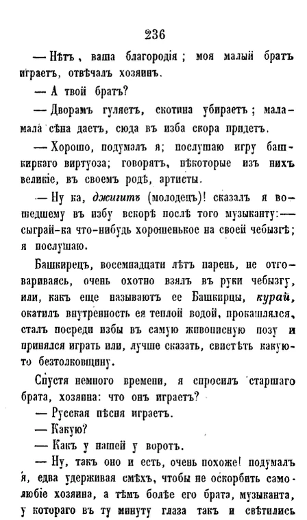 Песни башкир плавны, заунывны, в общем мелодичны и разнообразнее, чем казанских татар. Музыкальные инструменты — «чибизга» (род флейты и «кобыз» (металлич. кружок с язычком, вставляемый в рот).