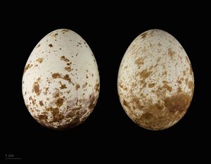В кладке обычно 2-4 яйца (иногда 1-6).[2][3][68][17][98]. В Украине средний размер кладки — 2,7 (n=8), на Кипре — также 2,7, в Северной Африке — 2,54 (n=57), в Иране — 3, в Китае — 3,3[68][99].[100][71][82] Яйца овальные, беловатые с желтоватым оттенком и неясными пятнами. Размеры: Украина — 59,5×46,9 мм, Армения — 60,3×47,2 мм, Китай — 56×43 мм; высота — 53-63 мм, диаметр — 42-49,5 мм; масса — 72,9 г (Армения), 68,2 г (Китай)[34][68][82] Насиживание — 28-30 дней.[2][3]