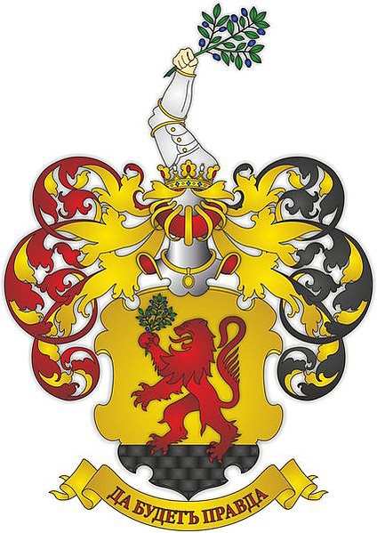 На щите дворянский коронованный шлем. Нашлемник: рука вверх, в серебряных латах держит зелёную миртовую ветвь Намёт на щите справа — червленый с золотом, слева — чёрный с золотом. Девиз: «ДА БУДЕТ ПРАВДА» червлеными буквами на золотой ленте.