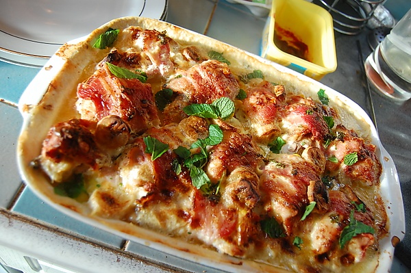 Джейми Оливьер предлагает приготовить это блюдо, используя куриные грудки, начинённые бананом, завёрнутые в бекон и запечённые со свежими кукурузными зёрнами, фасолью каннеллини, белым вином, сливками и сливочным маслом[6].