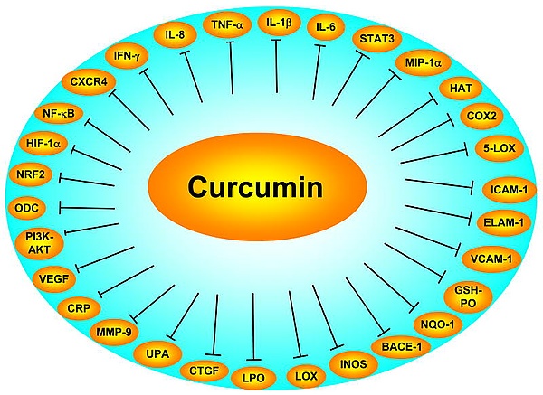 - Потенциальное противовоспалительное. В лабораторных экспериментах куркумин ингибировал молекулы, участвующие в воспалении, например фосфолипазу, липооксигеназу, ЦОГ-2, лейкотриены, тромбоксан, простагландины, оксид азота, коллагеназу, эластазу, гиалуронидазу, хемоаттрактантный белок моноцитов-1 (MCP-1), интерферон-индуцируемый белок, ФНО и интерлейкин-12[21]. Регулирует факторы транскрипции, цитокины, протеинкиназы, молекулы адгезии, ферменты, связанные с воспалением, что позволяет предположить его потенциал в профилактике и лечении воспалительных заболеваний[22]. Может использоваться в качестве поддерживающей терапии при лечении хронических воспалительных заболеваний, в частности, при язвенном колите[23]. В комплексе с фосфатидилхолином у некоторых больных остеоартрозом снижает боль в суставах и улучшает их функции; может применяться для долгосрочного лечения остеоартрита в качестве дополнительной терапии[24][25].