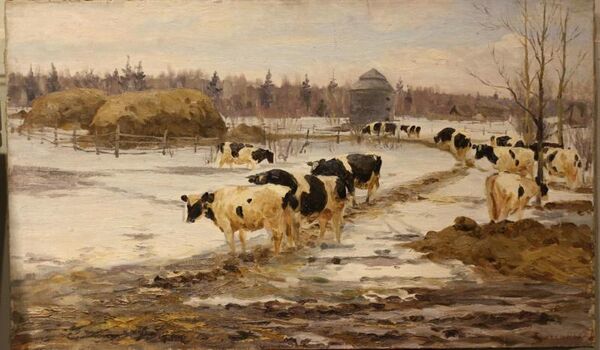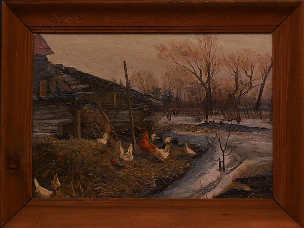 На полотне представлен весенний пейзаж (живопись), в котором на переднем плане слева, на проталине у деревянного сарая, изображены курочки и петух. Задний план занимает ряд деревьев и силуэты домов на фоне светлого неба. Колорит картины построен на сочетании охристо-коричневых и бело-серых тонов с отдельными акцентами оранжевого и красного цветов.