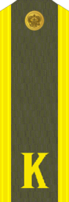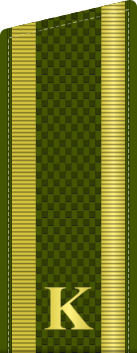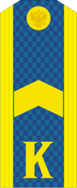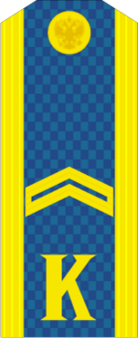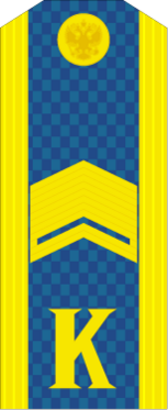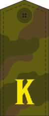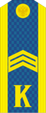 На погонах размещена буква «К» золотистого цвета. Высота буквы — 20 мм, расстояние от нижнего края погона до буквы — 15 мм. На погонах старшин, сержантов и ефрейторов в соответствии с воинским званием размещены металлические угольники золотистого цвета.[6]