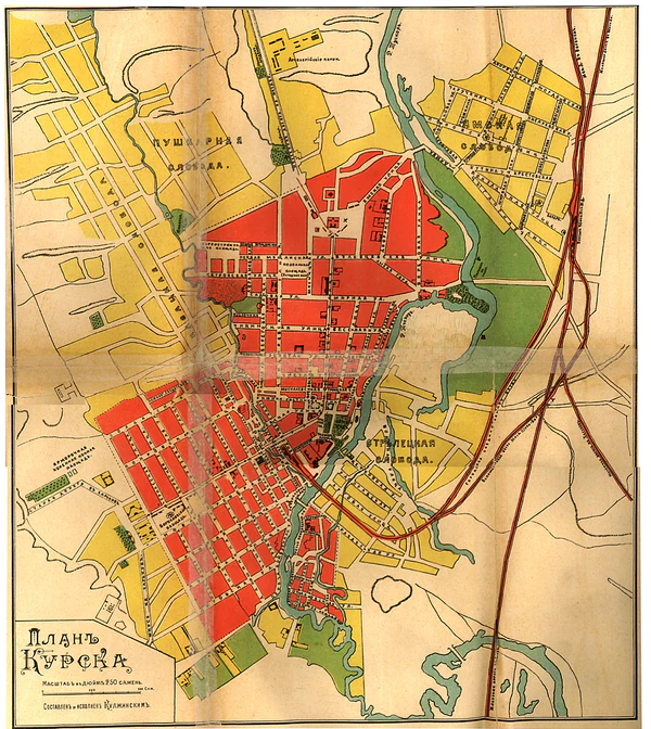 По состоянию на 1900 год город Курск благодаря своему расположению имел очень живописный вид. Масса зелени, все береговые склоны реки Тускори были заняты плодовыми садами, относительно небольшое количество фабрик и заводов, выгодно отличали его среди прочих губернских городов, расположенных в южной части средней России[6].