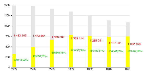 | Русские | 2.336.510 (80,42 %) | 1293663 (96,9 %) | ↘ 1184049 (96,1 %) | ↘ 1036561 (96,5 %) |